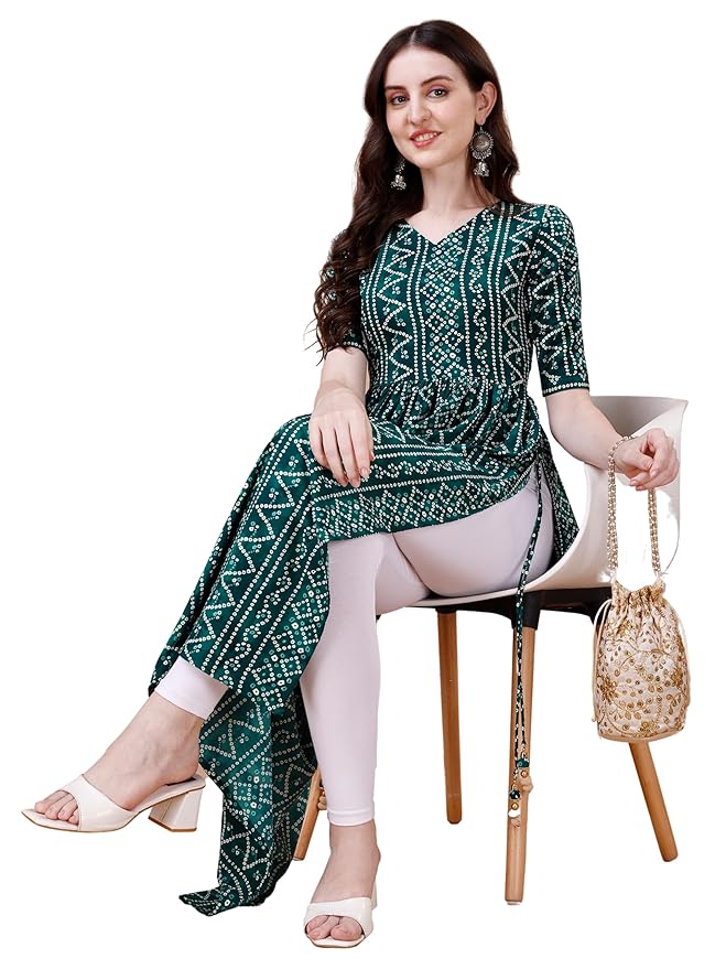 - This cool naira cut flared kurta with a high slit & bandhani print is trendy and stylish for any occasion, function or festival! It has pretty bunch of handmade latkans and is gathered from the middle, which makes it different from other kurtas.
